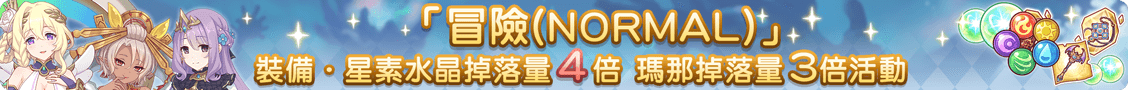 活動期間,通關主線冒險(NORMAL)時可獲得的裝備道具和星素水晶球獲得量將變為平常的4倍,瑪那獲得量將變為平常的3倍。