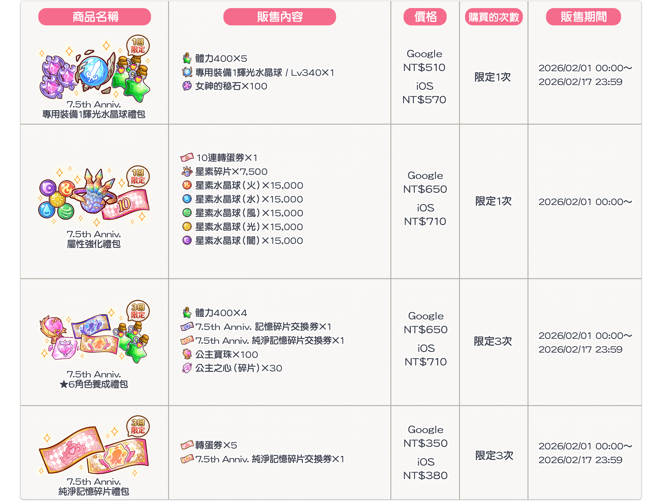 2. 本公告中所刊載的商品於販售期間內,在所有平台上,各個禮包僅能於規定次數內購買。