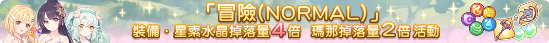 通關主線冒險(NORMAL)時可獲得的裝備道具和星素水晶球獲得量將變為平常的4倍,瑪那獲得量將變為平常的2倍!