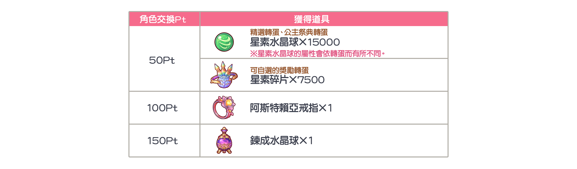 ※50Pt能獲得的道具,會依轉蛋而有所不同。詳情請選擇「轉蛋頁首」畫面的所持角色交換Pt欄的[i]按鈕,於「獎勵一覽」的對話視窗進行查看。