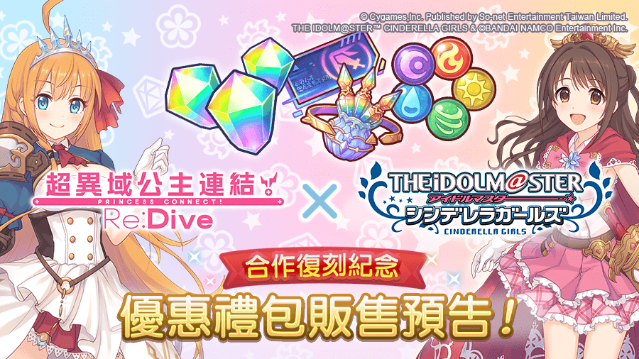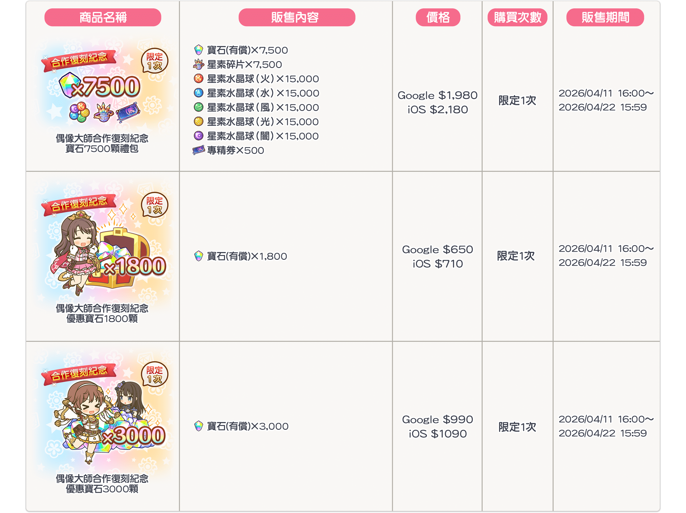 2026/04/11 16:00 起,進行《偶像大師 灰姑娘女孩》合作復刻紀念,將以期間限定方式開始販售3種優惠禮包!